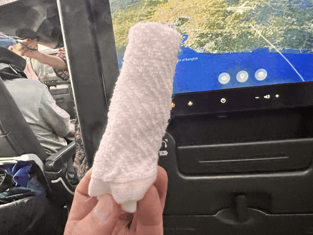 搭乗してすぐに配られるのが、温かいホットタオル。
