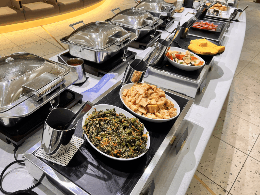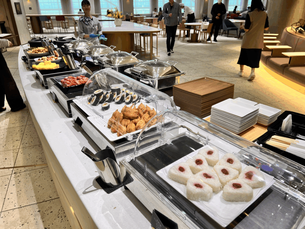 ラウンジ内には広めのビュッフェカウンターが設けられており、和食・洋食・軽食・デザートまでバランス良く揃っていました🍱🍰 空腹で立ち寄っても十分満足できる、“レストランに近いレベル”の豊富さが印象的です。