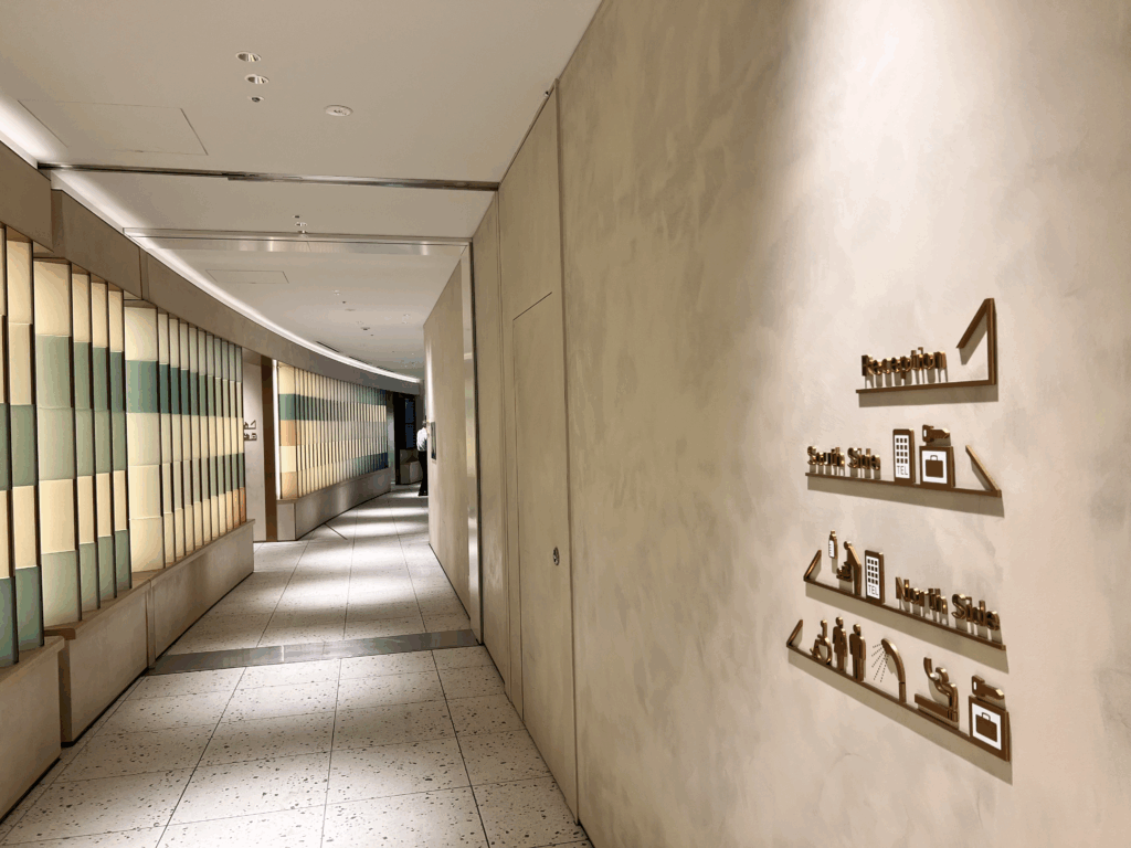 その通路には落ち着いた照明と木目調の内装が施されており、すでに洗練された空間の雰囲気が漂っていました。