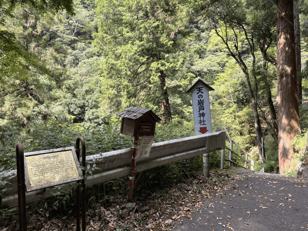 しばらく進むと、「天の岩戸神社」と書かれた木の看板が目に入ります。 この案内にしたがって足を進めると、視界の先に下へと続く長い階段が現れました。