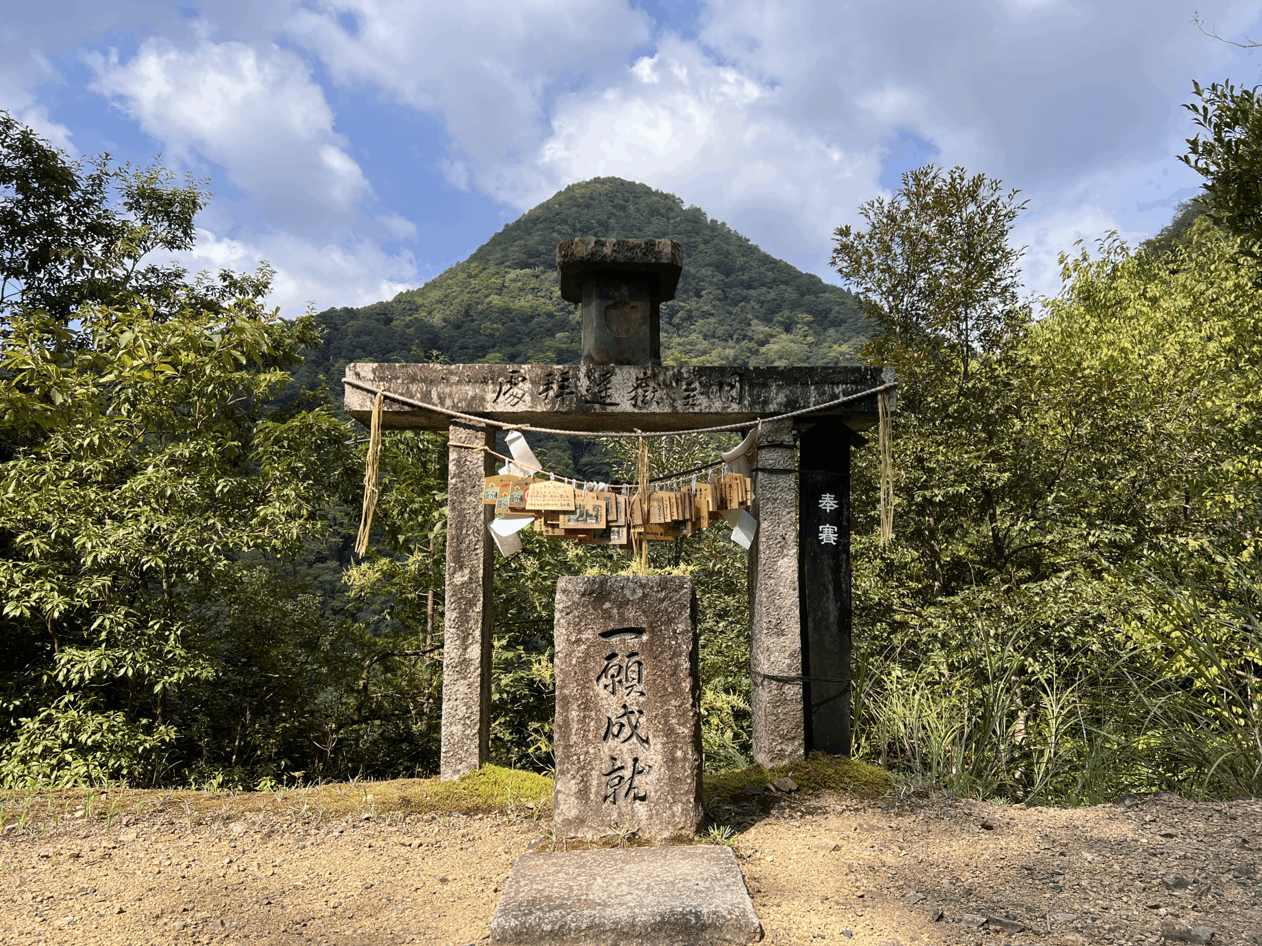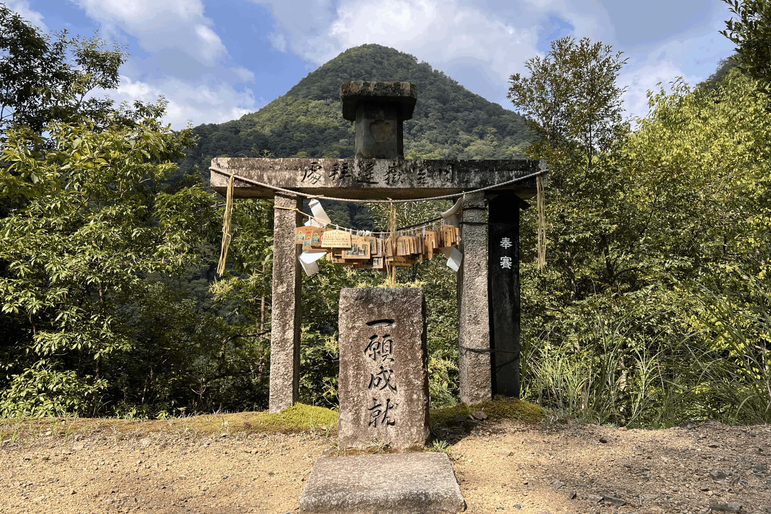 やがて現れるのが、小さな石の鳥居と「一願成就」と刻まれた石碑。 この場所には特別な社殿があるわけではありませんが、 正面にそびえる山こそが、この地において“ご神体”とされているのです。