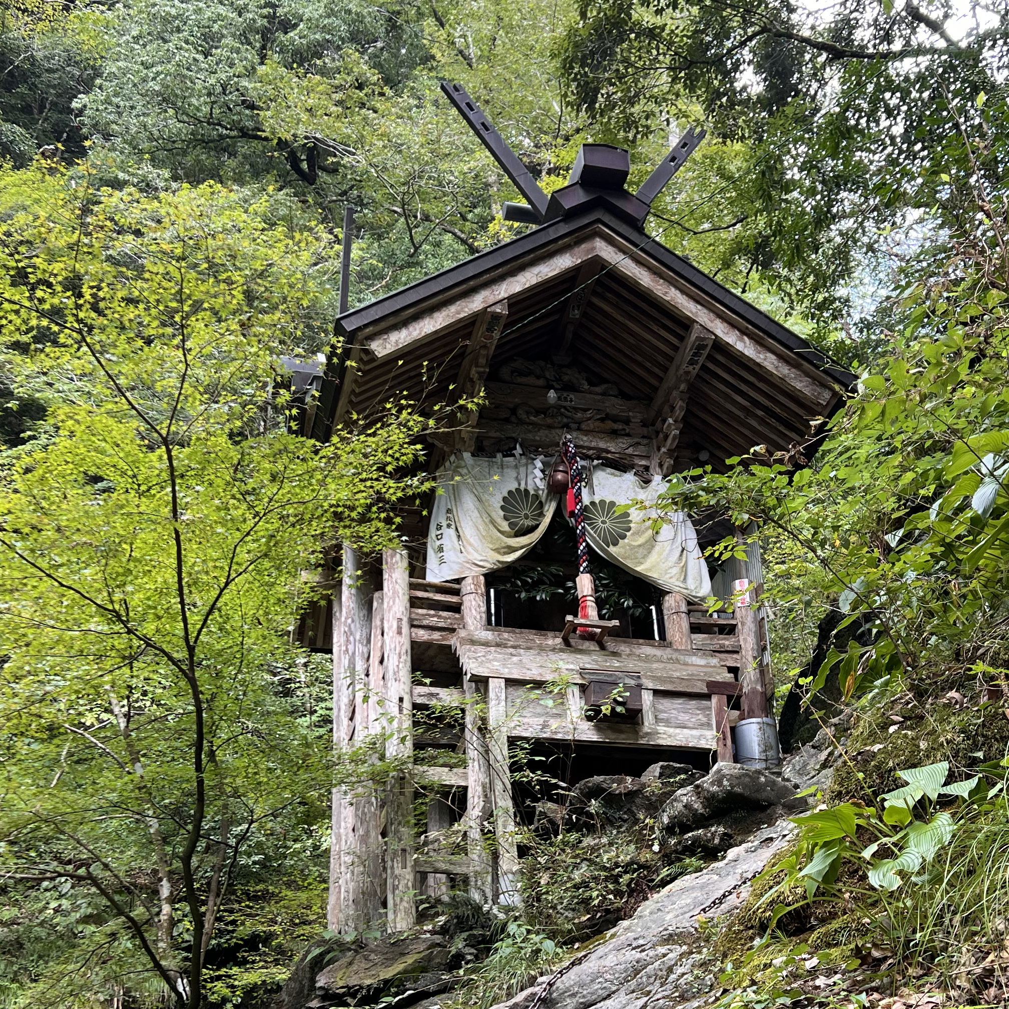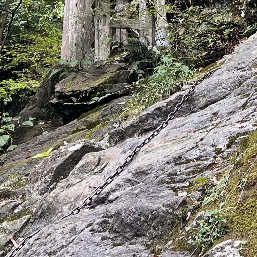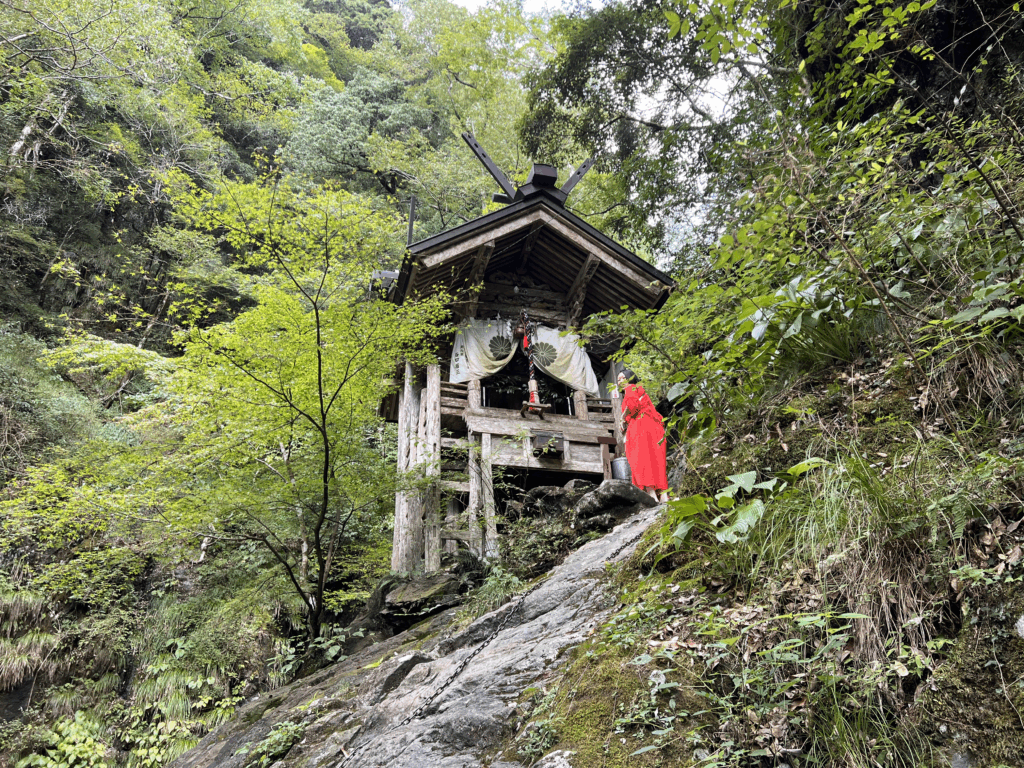川の音に導かれるように進んでいくと、 やがて視界の先に、岩の上にひっそりと建てられた小さな祠が見えてきます。 この祠へ向かうには、岩肌に取り付けられた鎖や縄を頼りに急な斜面を慎重に登る必要があります。 足元が滑りやすいため、無理のないようゆっくりと登ってください。