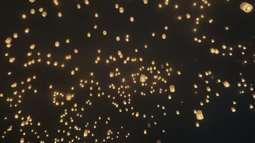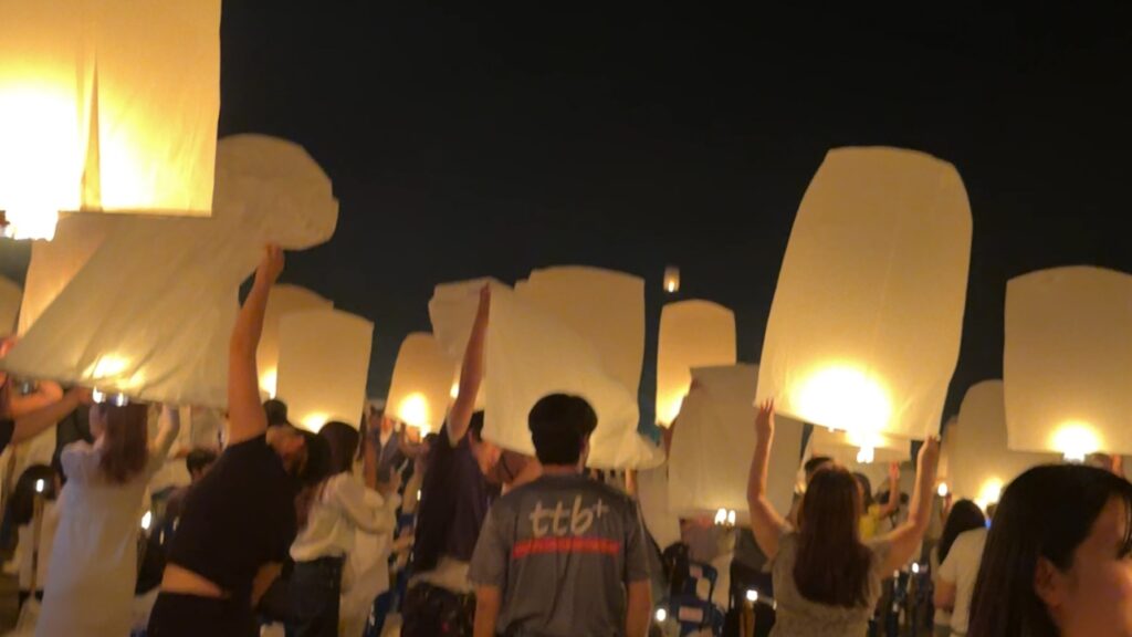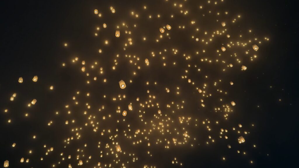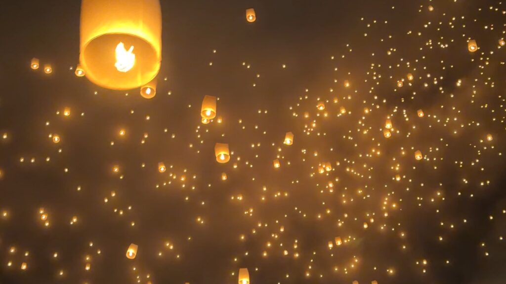 何千ものランタンが一斉に空へと放たれ、黄金色の光が夜空へ舞い上がっていきます。