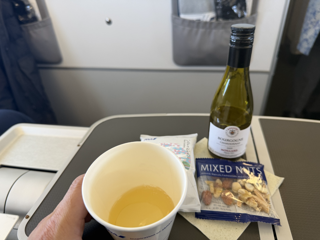 離陸後、機内が落ち着いてしばらくすると、プレミアムクラスの食事サービスが始まります。