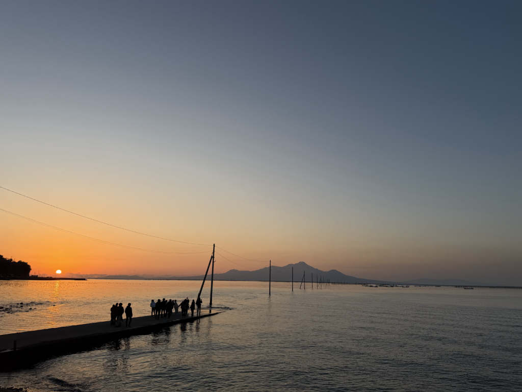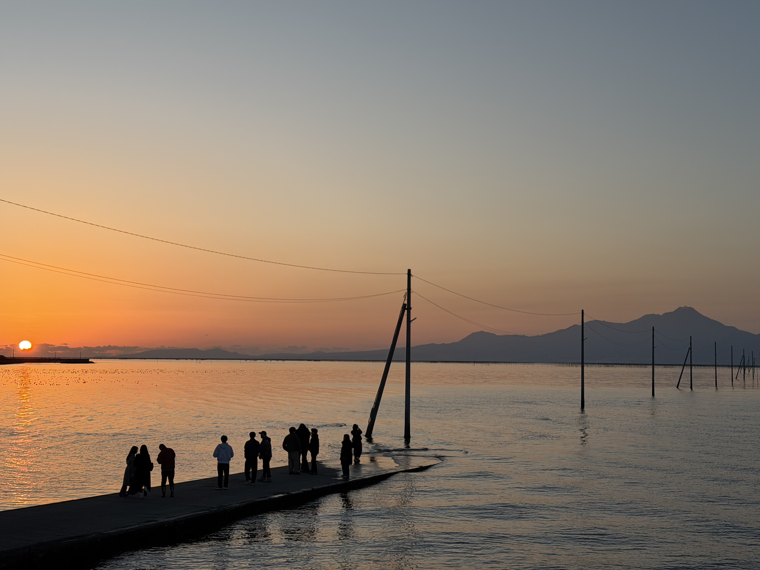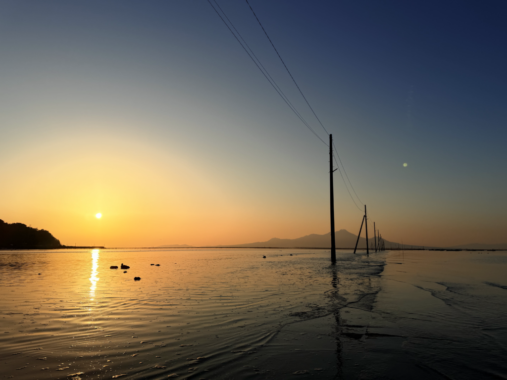 この場所は熊本県の有明海沿いにあり、昼は一本道の“線の美しさ”、夕方は満潮と夕日が重なって幻想的な景色が楽しめます。