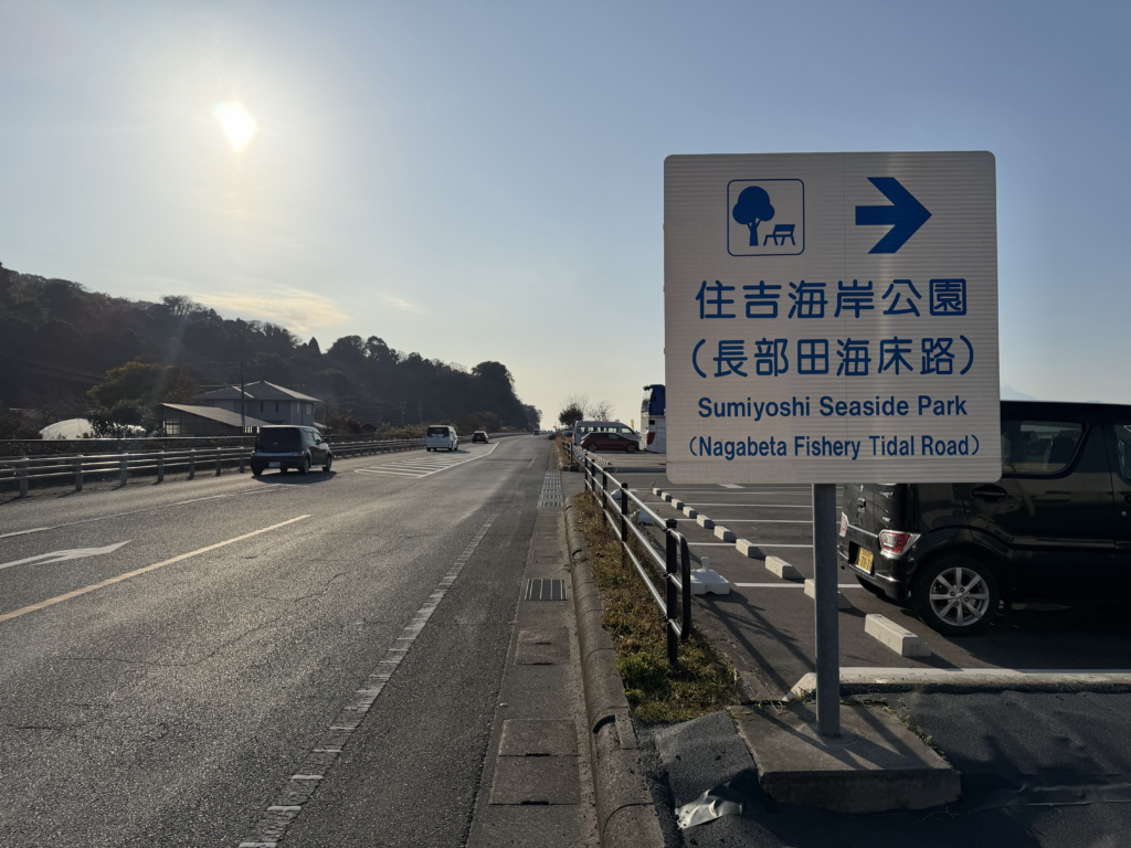 案内板には「住吉海岸公園(長部田海床路)」と表示されていて、現地でも目印が分かりやすいのが助かりました。