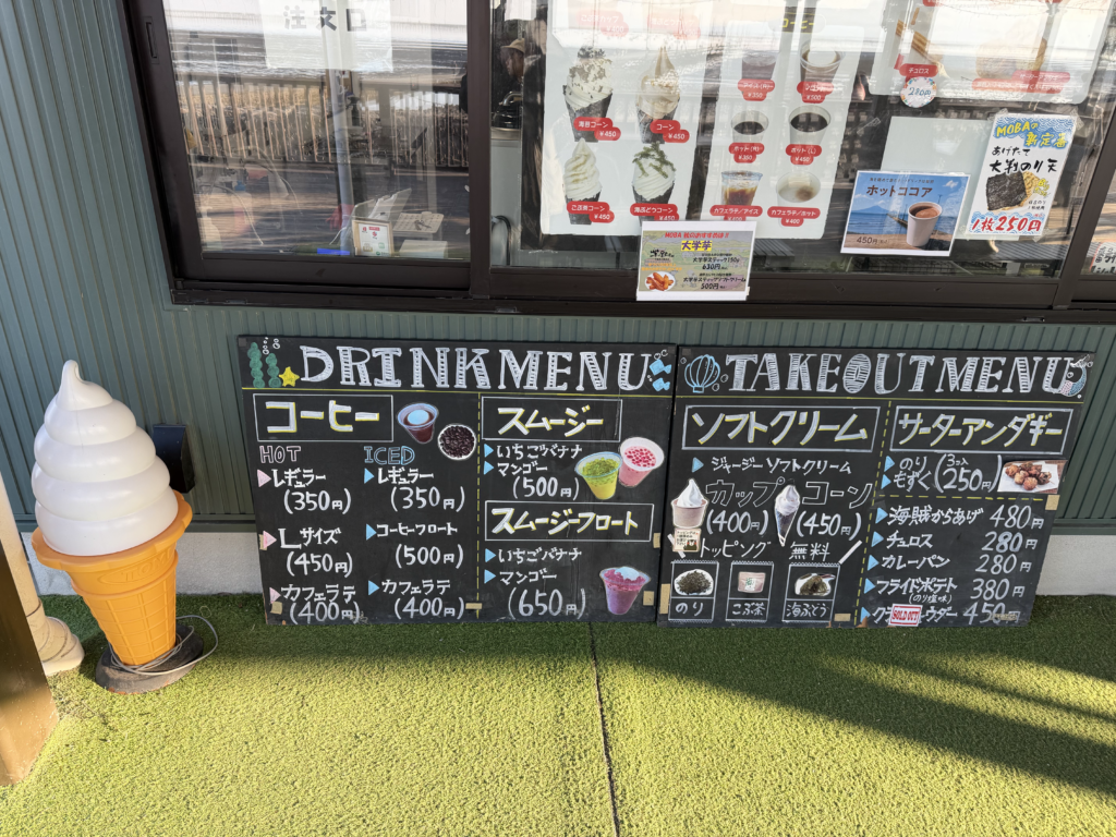 近くのカフェではコーヒーやスムージー、ソフトクリームが楽しめて、ちょっとしたお土産も