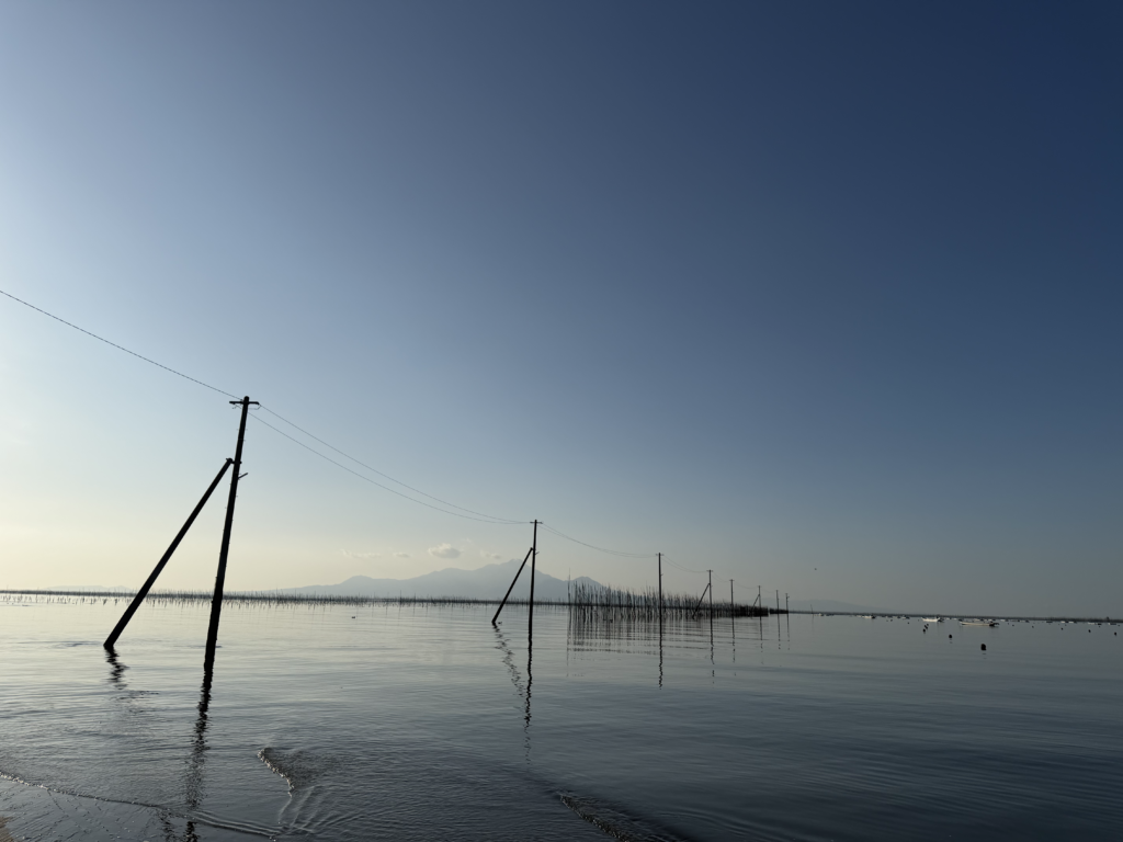 見渡すと有明海がどこまでも広がっていて、風が落ち着くと水面が鏡みたいに光る瞬間が