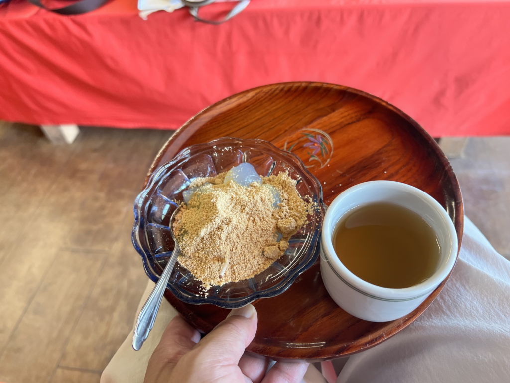 今回いただいたわらび餅は、きな粉の香ばしさとほんのりした甘さが絶妙で、歩いたあとの体にやさしくしみるようなおいしさでした。