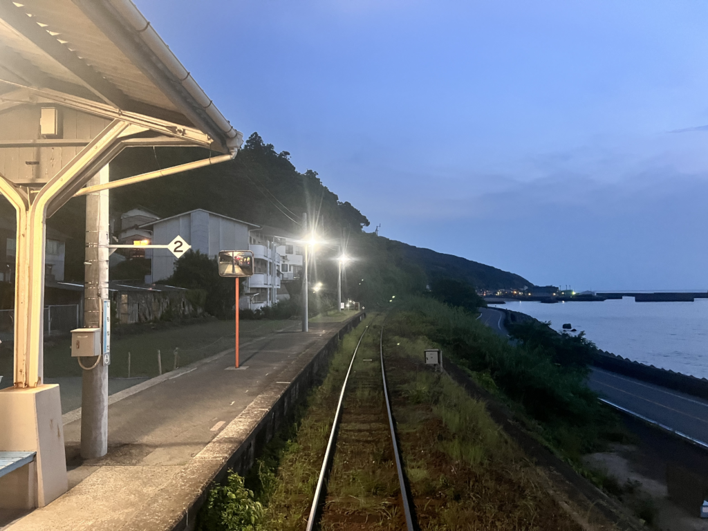 昼の青い海も、夕方のやわらかな空も、日が落ちたあとの静かなホームも、それぞれに違った魅力があって、気がつけば長い時間をこの駅で過ごしていました。こういう場所に出会えると、やっぱり旅っていいなと思いますよね。