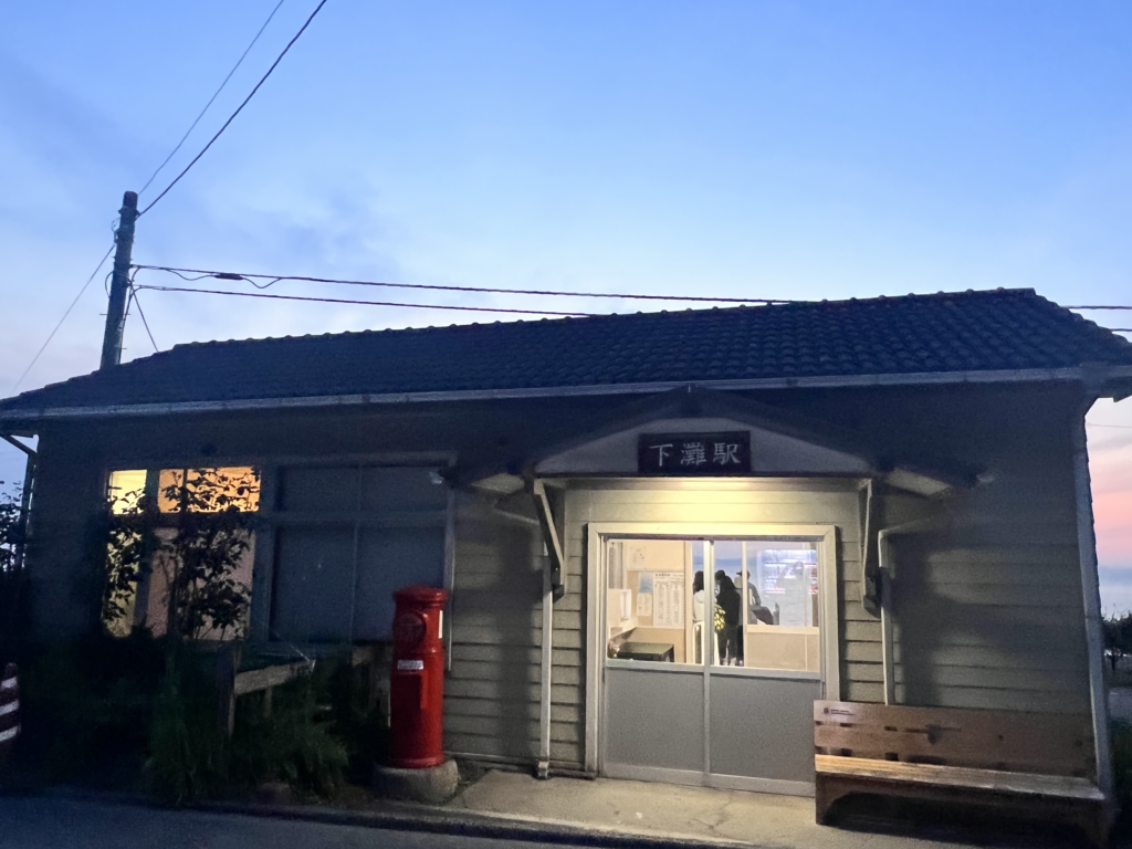 線路が暗がりの中へ伸びていく景色にも旅情があって、最後までこの駅にいたくなる気持ちがよくわかりました。こういう時間まで味わえるのも、下灘駅の大きな魅力なのかもしれません。