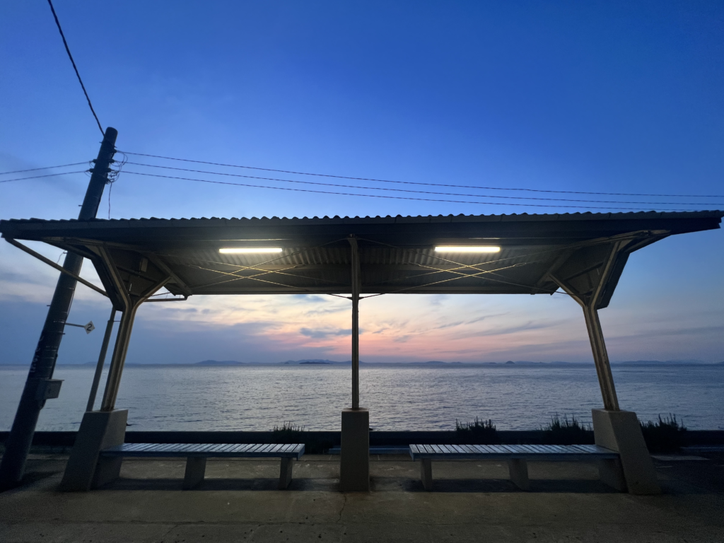 空に少し青さが残る時間帯になると、ホームの灯りがやさしく見えてきて、昼間とはまったく違う表情になります。海は静かで、駅全体もどこか落ち着いた雰囲気に包まれていて、にぎやかな観光地とは違う、しんとした美しさがあるんです。